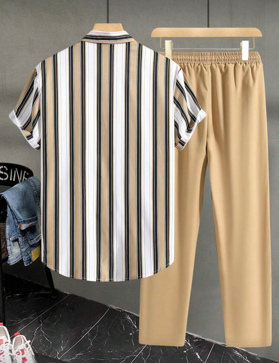 SHEIN Men’s 2-Piece – Striped Short-Sleeve Shirt & Tan Trousers